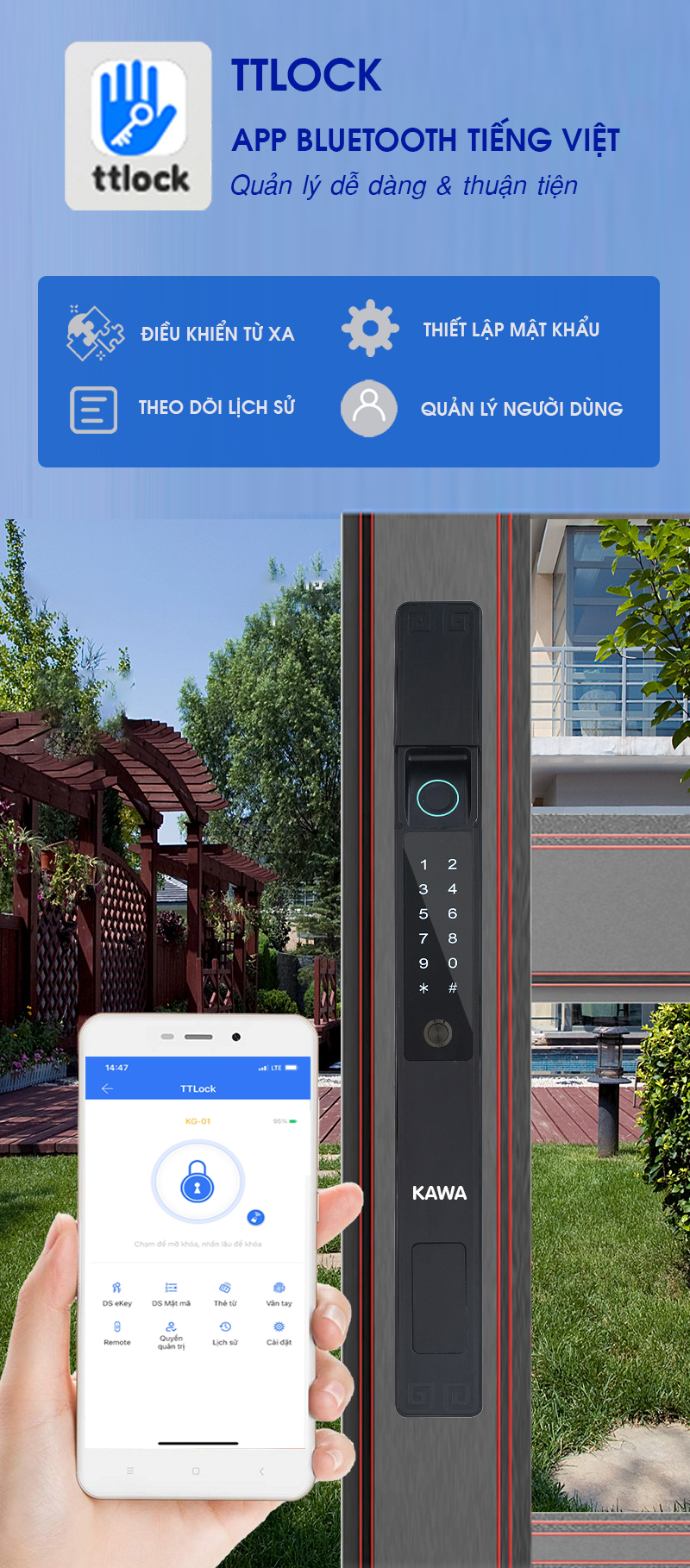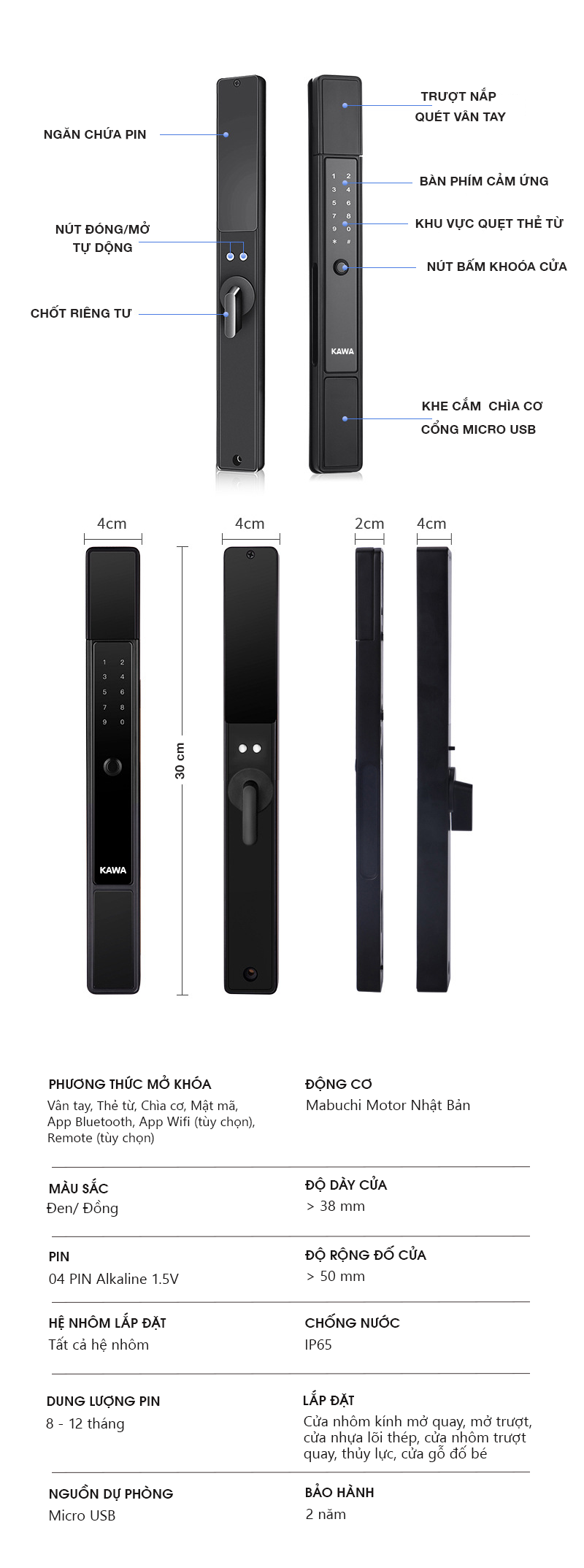 Mẫu khóa vân tay cửa nhôm KAWA KN302 được bảo hành chính hãng tại nhà 2 năm, đổi mới hoàn toàn 1-1 trong vòng 12 tháng nếu bị lỗi từ nhà sản xuất.