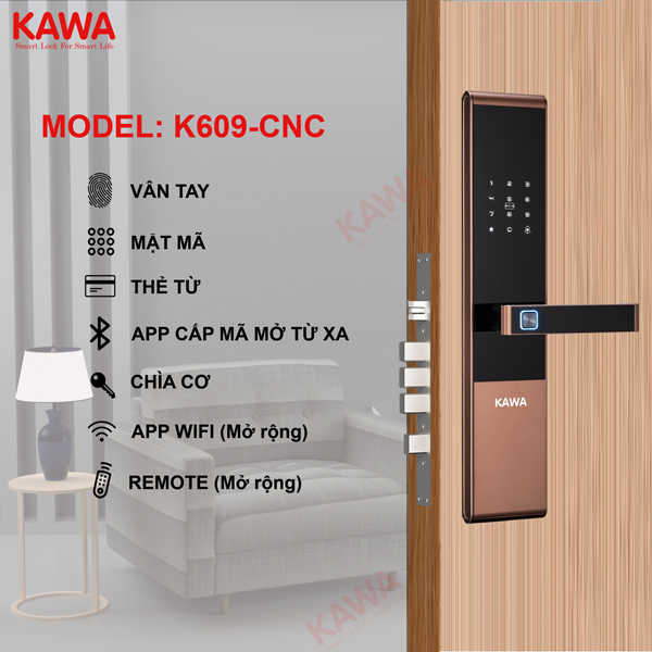 Model K609 CNC là sản phẩm khóa vân tay điện tử mới ra mắt 2025 từ thương hiệu KAWA. Đây là sản phẩm khoá điện tử dòng tay gạt được sản xuất bằng vật liệu nhôm nguyên khối CNC, công nghệ Anode đầu tiên trên thị trường Việt Nam.